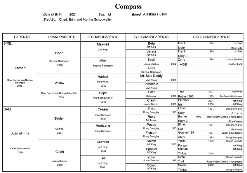 Compass, formerly known as Bobo, may have been the runt of the litter but grew up to be a huge, goofy moose. He wants to be friends with EVERY dog and even though he will initiate play with any dog, he is also very polite and will back off to avoid tension. Compass is incredibly bombproof, bouncing back quickly from any stress I've seen him experience, and is just overall a happy-go-lucky man. He loves pets and cuddles from his human friends just as much as he loves zooming around with his dog friends. He is a true loverboy, leaning into my chest and body for the most surface area of hug possible. Compass does a cute little prancing walk when he gets EXTRA happy, but his stride in harness is exceptional. He has an extremely smooth, straight, and effortless gait despite his size and he is a force to be reckoned with on the team. Compass sees my tires, truck and ATV, as Prime Peeing Real Estate and makes sure EVERYONE knows that he was there.
